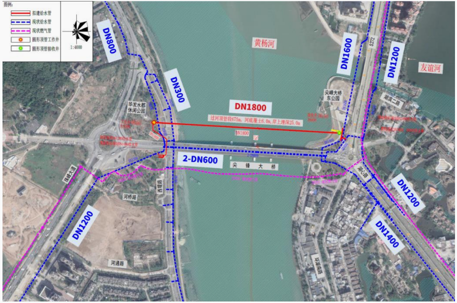 本項目建設內容包括尖峰大橋處新建1根DN1800給水主干管約925m;東岸與省道S272現DN1600供水主干管接駁,聯通現狀DN800給水管,并預留后期規劃DN1800給水管接駁口;西岸與西堤路現狀DN1200供水主干管接駁、預留DN1600遠期規劃供水管接駁口。