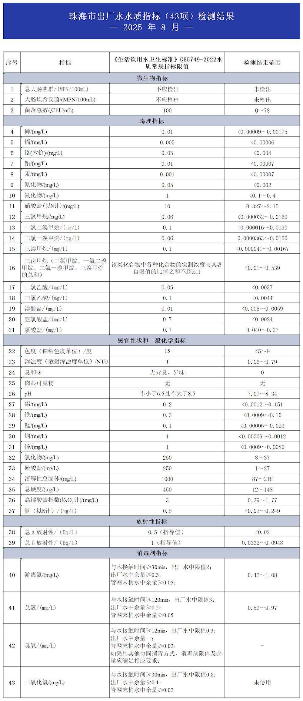 2025年8月珠海市出廠水水質(zhì)指標(43項)檢測結(jié)果 發(fā)布時間:2025年09月15日 瀏覽次數(shù): 次 小大 原文下載:2025年8月珠海市出廠水水質(zhì)指標(43項)檢測結(jié)果.xls 【打印正文】